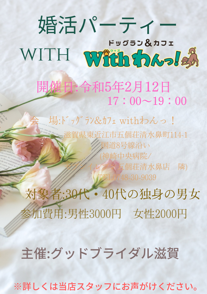 今週末の日曜日の夕方、2月12日(日)PM17:00から、当店「withわんっ!」で、「グッドブライダル滋賀」様主催の“婚活パーティー”が開催されます。