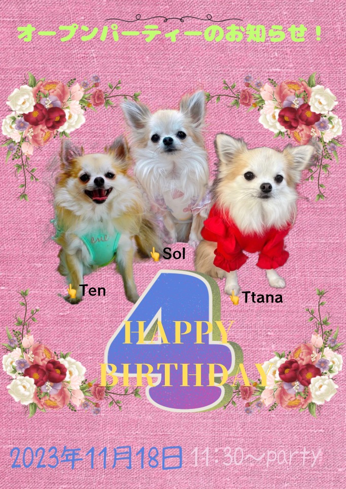 チワワのソルちゃん、タナちゃん、テンくん4歳のお誕生日パーティーを開催いたします!